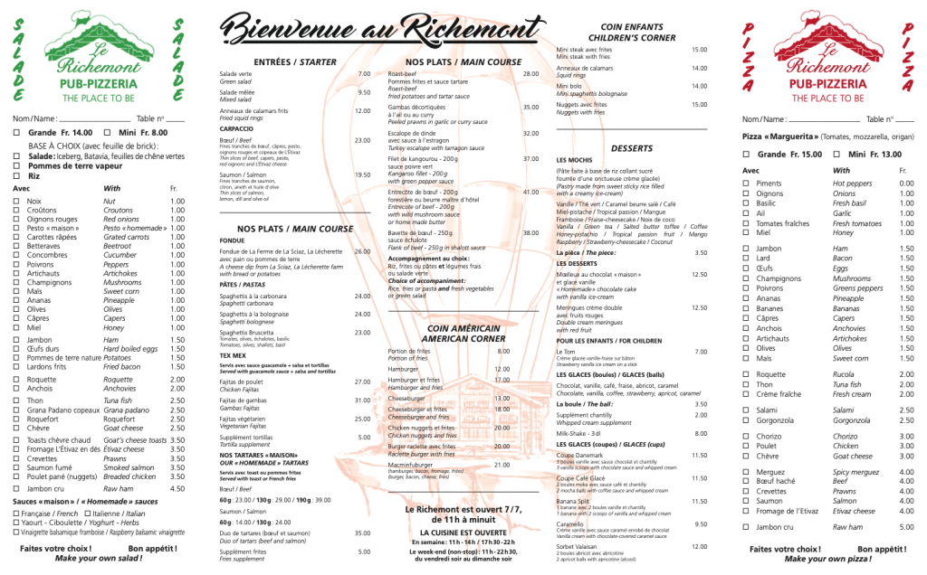 Salade Richemont * Tomates, lardons, croûtons, gruyère, oeuf dur. * Tomatoes, bacon, croutons, gruyère cheese, egg. | 21.- |